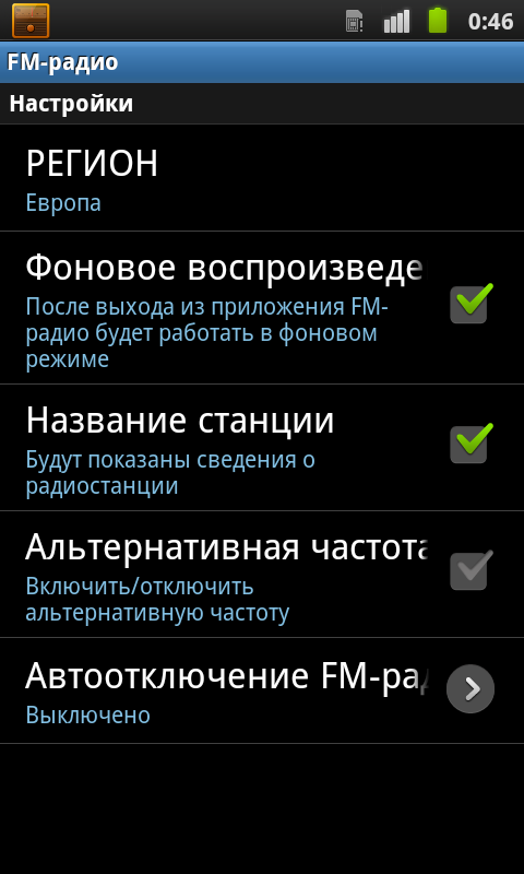 | Дополнительно | Android 2.3.6 есть возможность установки стороннего приложения-радиоприёмника Sprit FM (требуются root-права) для получения расширенного функционала (расширенный RDS, ввод частоты и др.) |